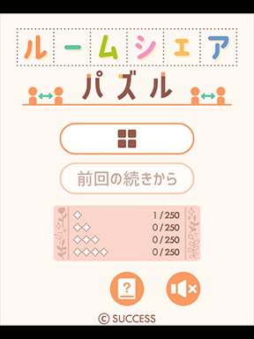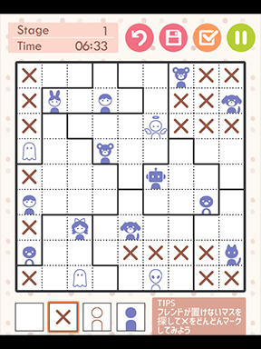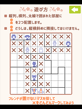 ルールに従い、タテ列ヨコ列および太線で囲まれた部屋にフレンドを2人ずつ配置していくロジックパズルゲーム。
