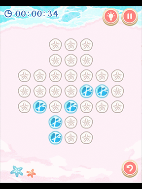 盤上にコマをルールに従って動かしていき、最後にコマがひとつになるとクリア!