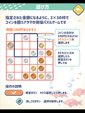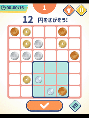 コインが置かれた盤面から、出題金額分のコインを3*3のマスで囲って探すゲームです。