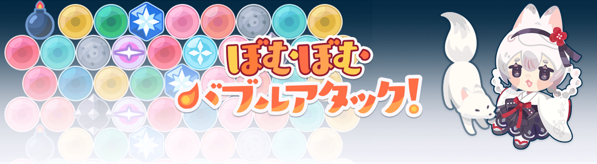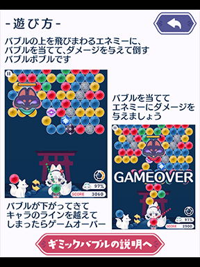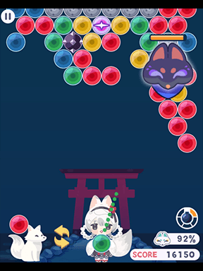 同じ色のバブルを3つ以上揃えて弾けさせ、飛び回る妖狐をやっつけるバブルシューターゲーム。
