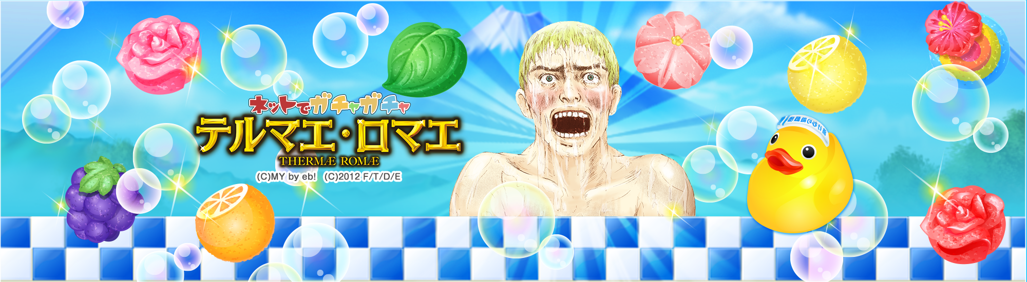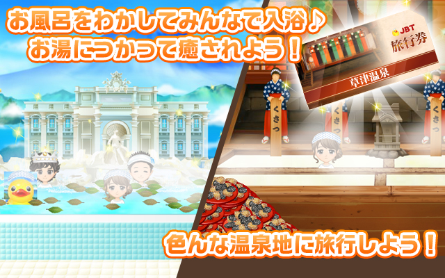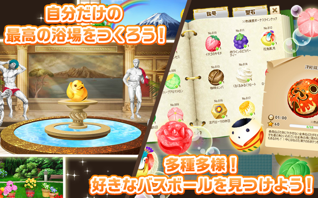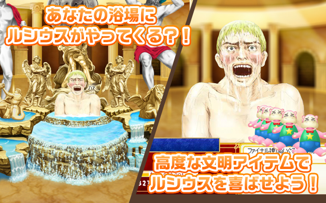 ソーシャルゲーム「テルマエ・ロマエ ネットでガチャガチャ」は、プレイヤーが「平たい顔族(日本人)」となり、自分の浴場(銭湯)を経営しながら、日本一の風呂屋を目指したり、風呂トモ(お友達)のお風呂に浸かったり、
