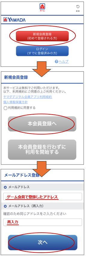 ➁ アプリを起動し、「ゲーム会員で使っていたメールアドレス」を入力